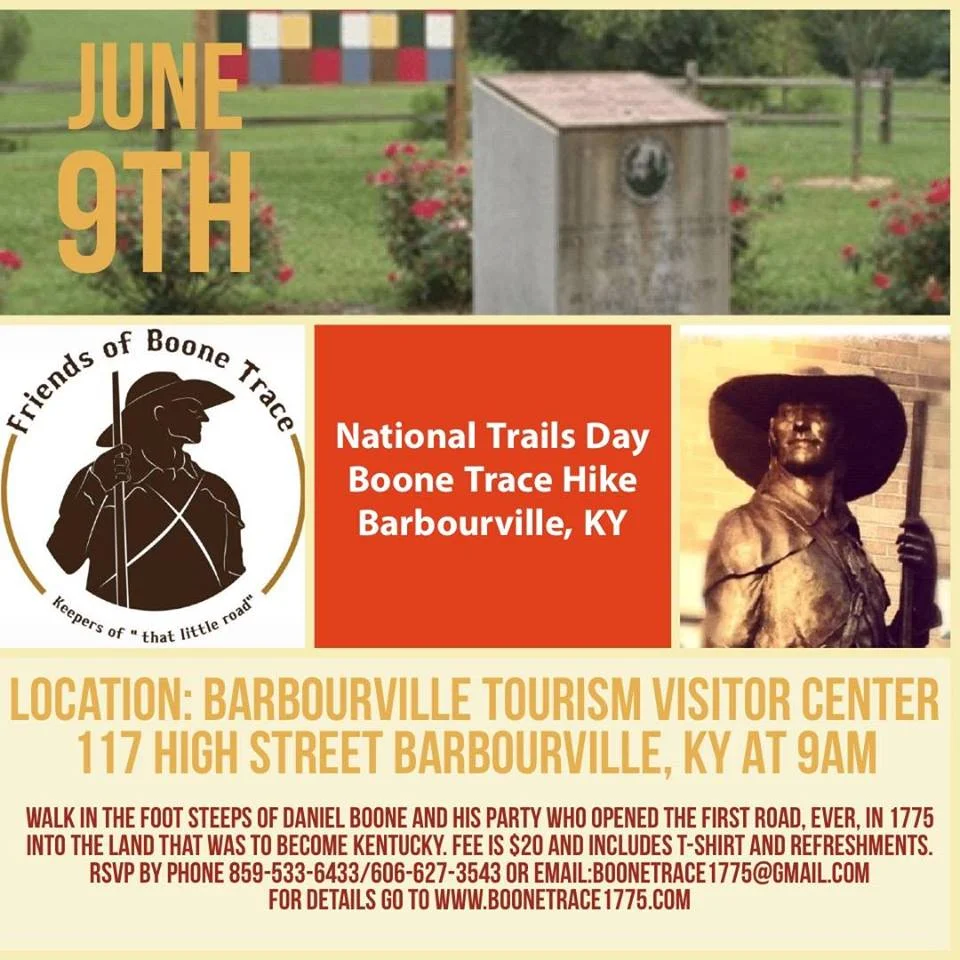 WALK IN THE FOOT STEEPS OF DANIEL BOONE AND HIS PARTY WHO OPENED THE FIRST ROAD, EVER, IN 1775 INTO THE LAND THAT WAS TO BECOME KENTUCKY. FEE IS $20 AND INCLUDES T-SHIRT AND REFRESHMENTS. RSVP BY PHONE 859-533-6433/606-627-3543 OR EMAIL:BOONETRACE1775@GMAIL.COM (To get a t-shirt RSVP by May 29th.)