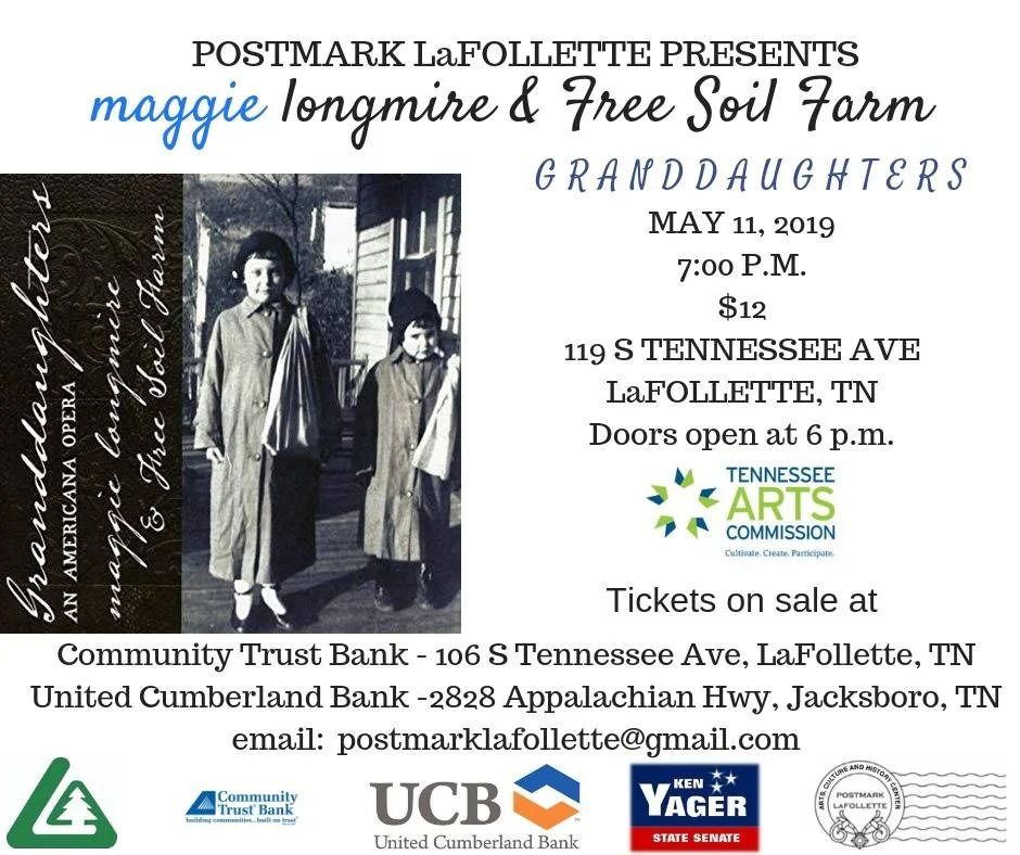 Maggie grew up in LaFollette. Granddaughters is her musical representation of the years she spent in Campbell County. She will describe what inspired the songs along with the members of her Free Soil Farm musicians. Tickets are on sale at Community Trust Bank, Downtown LaFollette, and United Cumberland Bank in front of WalMart. Ticket are $12