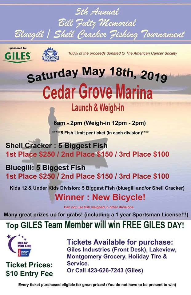 Back to All Events Bluegill / Shell Cracker Fishing Tournament - CLAIBORNE COUNTY Saturday, May 18, 2019 6:00 AM 2:00 PM Google Calendar ICS