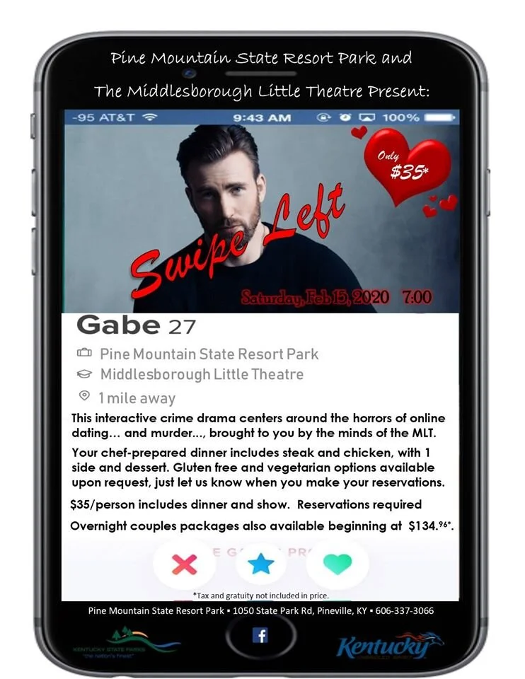 Back to All Events Swipe Left - BELL COUNTY Saturday, February 15, 2020 7:00 PM 9:00 PM Google Calendar ICS Pine Mountain State Resort Park1050 State Park Rd, Pineville, Kentucky This interactive crime drama is based on the horrors of online dating... and murder... Join us for an incredible interactive show and the finest food around. Valentines day has never been more fun.
