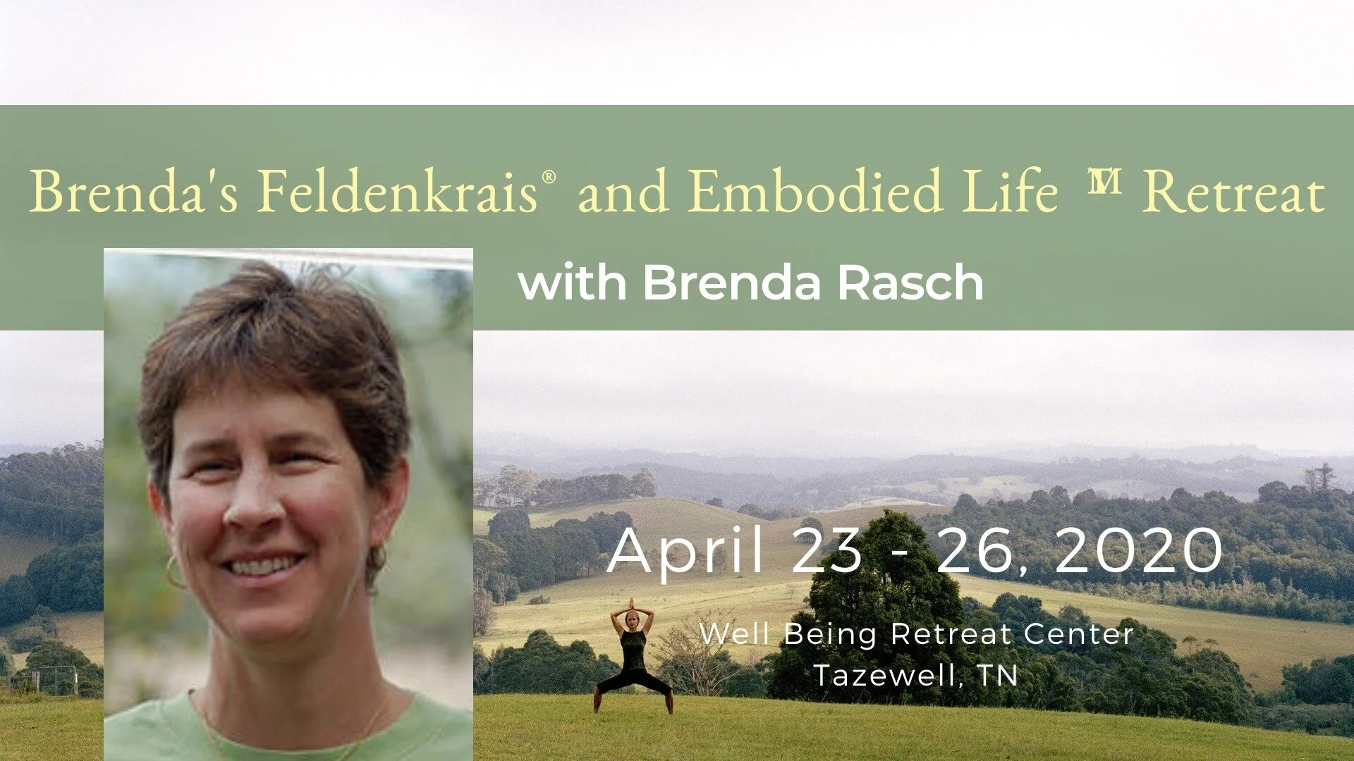 Brenda's Feldenkrais and Embodied Life Regreat - CLAIBORNE COUNTY Thursday, April 23, 2020 12:00 PM Sunday, April 26, 2020 1:00 PM Google Calendar ICS Well Being Retreat Center557 Narrows Road, Tazewell, Tennessee Brenda Rasch is a Physical Therapist with thirty plus years of practice specializing in working with autoimmune diseases and chronic pain, anxiety and stress disorders, orthopedics, manual therapy, therapeutic exercise, and industrial medicine.
