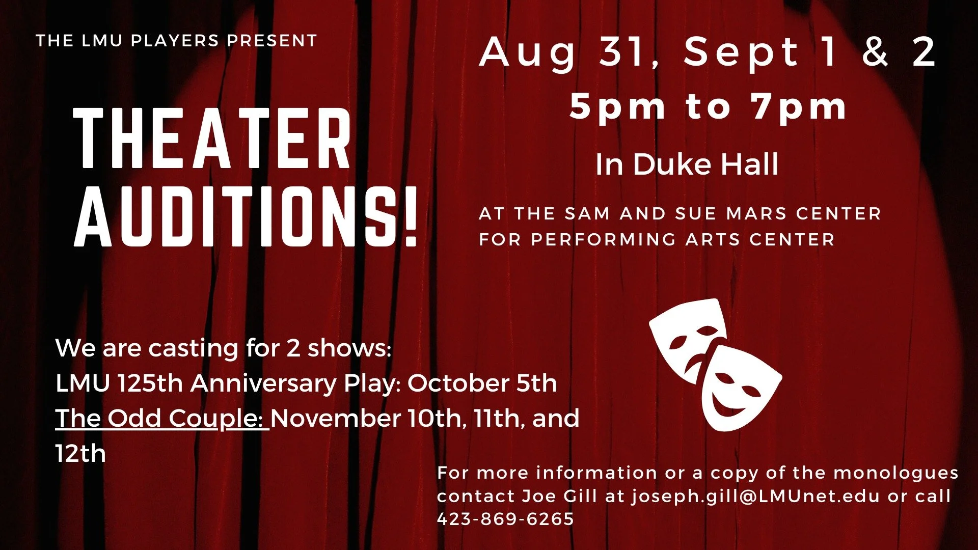 Join us for our auditions for our fall productions. We will be casting for Illuminating Blue and Gray: 125th Anniversary Production and The Odd Couple.