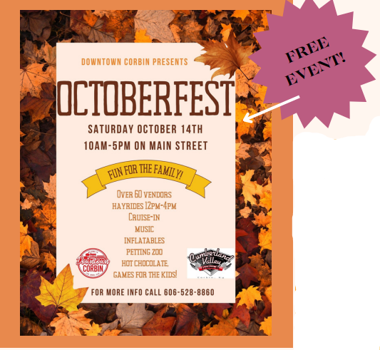 Octoberfest - WHITLEY COUNTY Saturday, October 14, 2023 10:00 AM 5:00 PM Cumberland Gap Region Tourism Association Main St Corbin KY United States (map) Google Calendar ICS