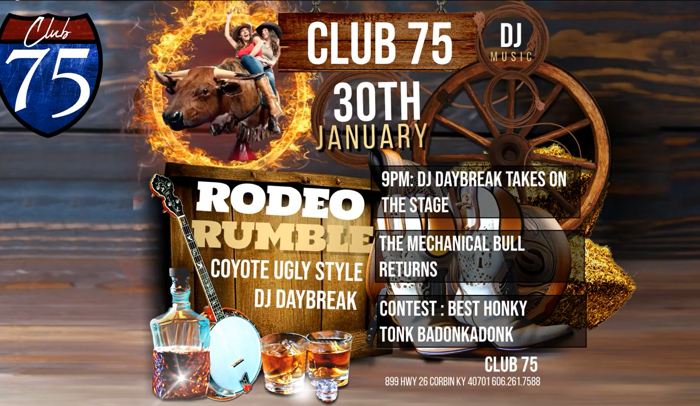 RODEO RUMBLE RETURNS Club 75 DJ DAYBREAK DJ starts at 9PM We’re bringing it back — COYOTE STYLE Mechanical Bull Best Honky Tonk Badonkadonk Contest Country • Party • Turn-Up Vibes Dust off your boots, grab your hat, and let’s rumble This one’s about to get WILD.