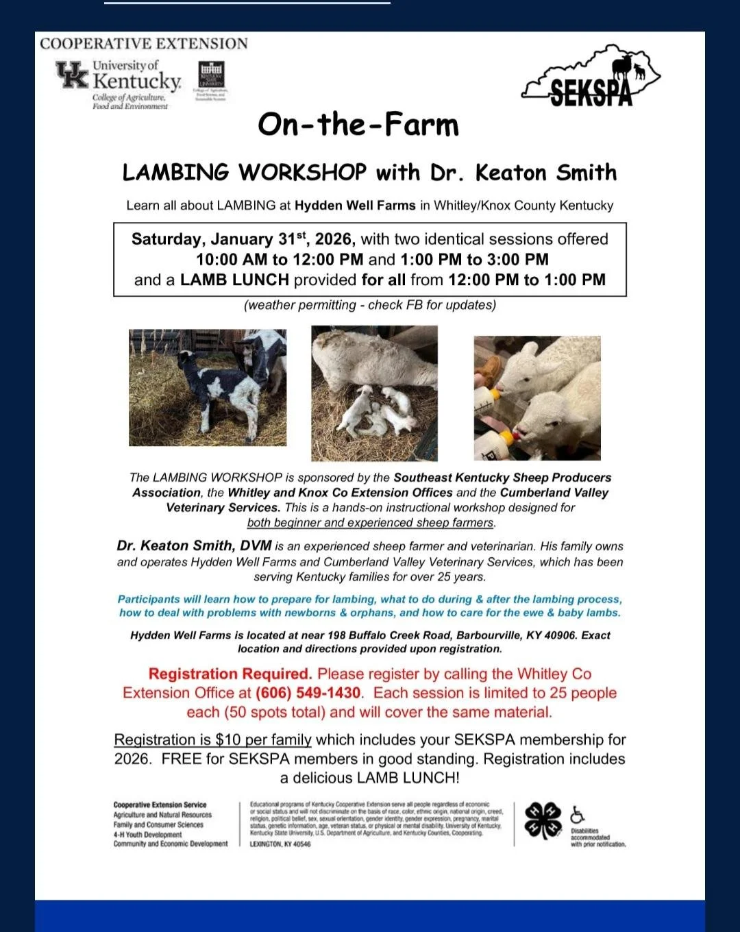 Participants will learn how to prepare for lambing, what to do during and after the lambing process, how to deal with problems with newborns and orphans, and how to care for the ewe and baby lambs.
