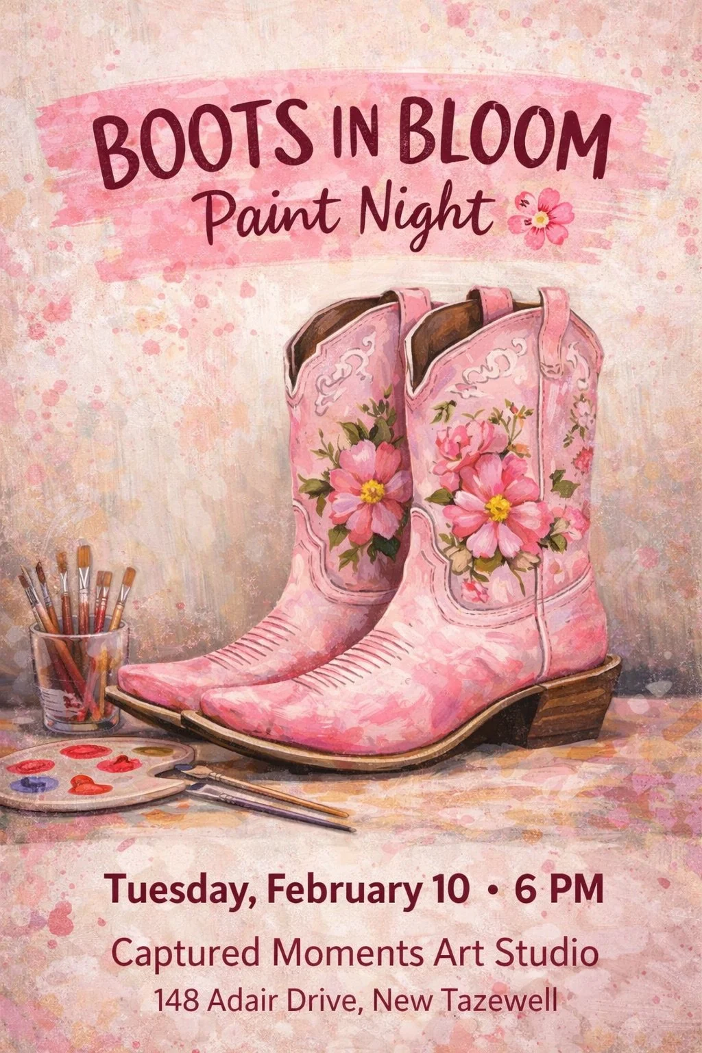 Come join me for a fun and relaxed Boots & Blooms Paint Night at Captured Moments Art Studio!