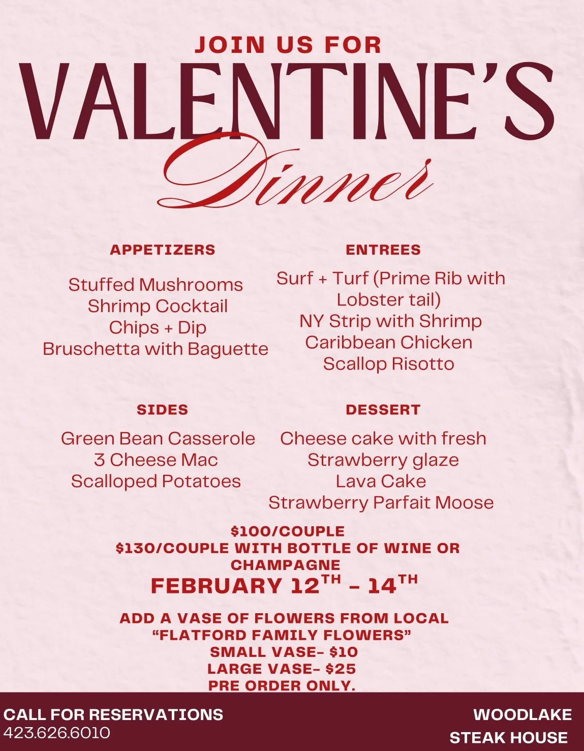 Valenties Dinner - CLAIBORNE COUNTY Thursday, February 12, 2026 5:00 PM Saturday, February 14, 2026 8:00 PM Woodlake Golf and Lodge 330 Woodlake Boulevard Tazewell, TN, 37879 United States (map) Google Calendar ICS