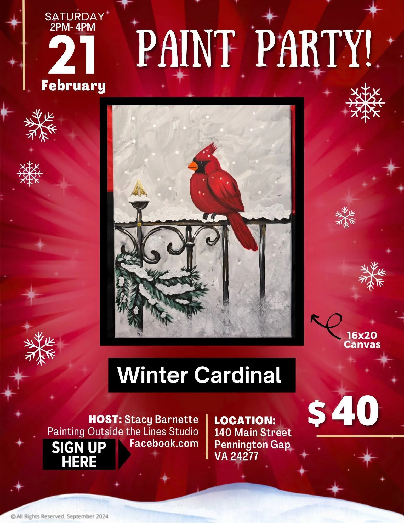 Paint Party - LEE COUNTY Saturday, February 21, 2026 2:00 PM 4:00 PM Painting Outside the Lines Studio 140 Main St Pennington Gap, VA United States (map) Google Calendar ICS Painting Outside the Line Studio